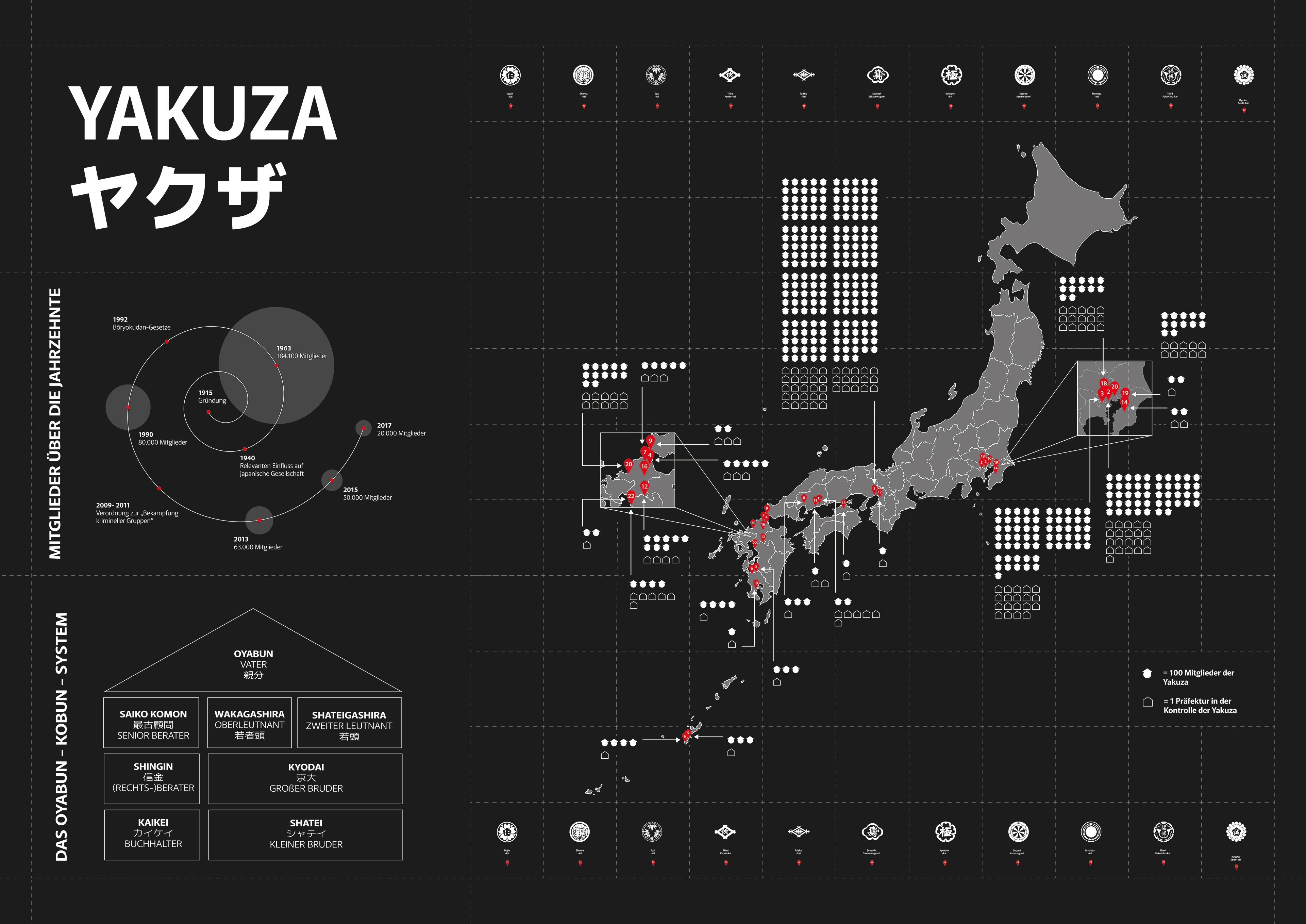 In meiner Arbeit habe ich mich den Yakuza beschäftigt, sie ist Japans bekannteste Mafia, organisiert in streng hierarchischen „Familien“ mit eigenen Ritualen und Symbolen wie großflächigen Tätowierungen. Sie ist in verschiedene illegale Geschäfte wie Erpressung, Glücksspiel und Schmuggel verwickelt. Trotz ihres traditionellen Ehrenkodex steht sie heute stark unter staatlichem Druck und ihre Zahlen sind über die Jahre stark gesunken.